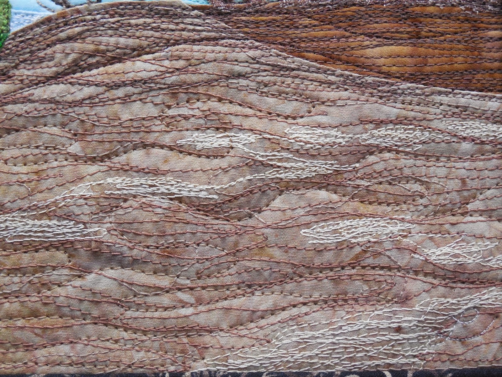 The sand is also heavily thread sketched to capture the shadows and the light coming through the trees.